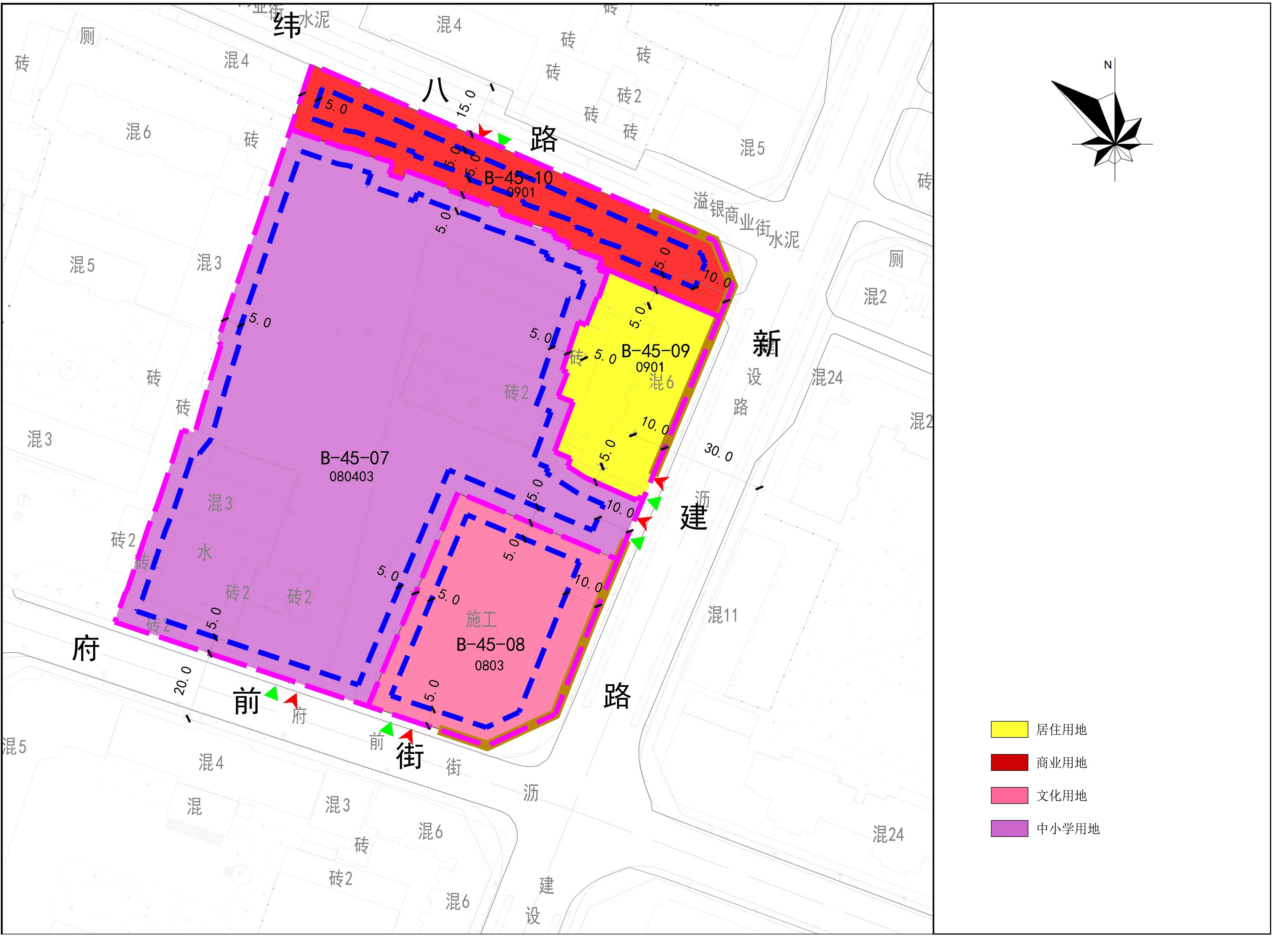 结合上位规划用地布局,规划B-45-07地块用地性质为中小学用地,B-45-08地块用地性质为文化用地,B-45-09地块用地性质为二类居住用地,B-45-10地块用地性质为商业用地。