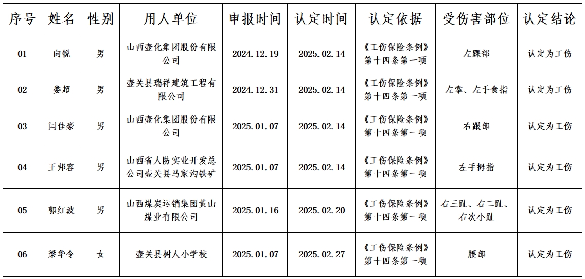 根据长治市人社局《关于转发<关于进一步加强工伤认定管理工作的通知>的通知》(长人社发〔2024〕13号)及《工伤保险条例》等有关规定,现将壶关县人力资源和社会保障局2025年2月作出的工伤认定决定予以公示,并接受社会监督。公示期为9天,公示时间为2025年3月3日至2025年3月11日。如对认定结果有异议,请向壶关县人力资源和社会保障局反映。壶关县人力资源和社会保障局将严格为提供线索和材料的人员保密。