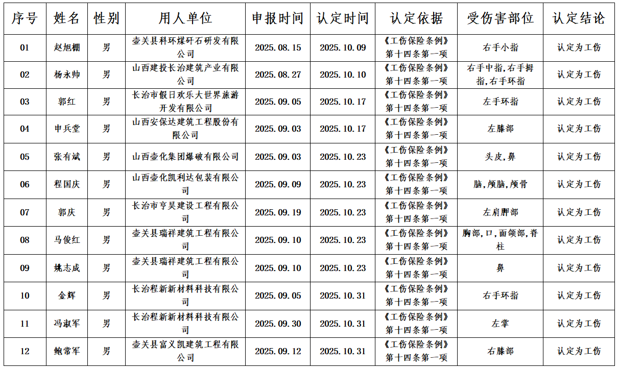 根据《工伤保险条例》等有关规定,现将壶关县人力资源和社会保障局2025年10月作出的工伤认定决定予以公示,并接受社会监督。公示期为9天,公示时间为2025年11月3日至2025年11月11日。如对认定结果有异议,请向壶关县人力资源和社会保障局反映。壶关县人力资源和社会保障局将严格为提供线索和材料的人员保密。