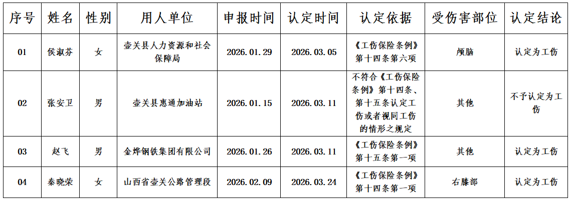 根据《工伤保险条例》等有关规定,现将壶关县人力资源和社会保障局2026年3月作出的工伤认定决定予以公示,并接受社会监督。公示期为9天,公示时间为2026年4月2日至2026年4月10日。如对认定结果有异议,请向壶关县人力资源和社会保障局反映。壶关县人力资源和社会保障局将严格为提供线索和材料的人员保密。