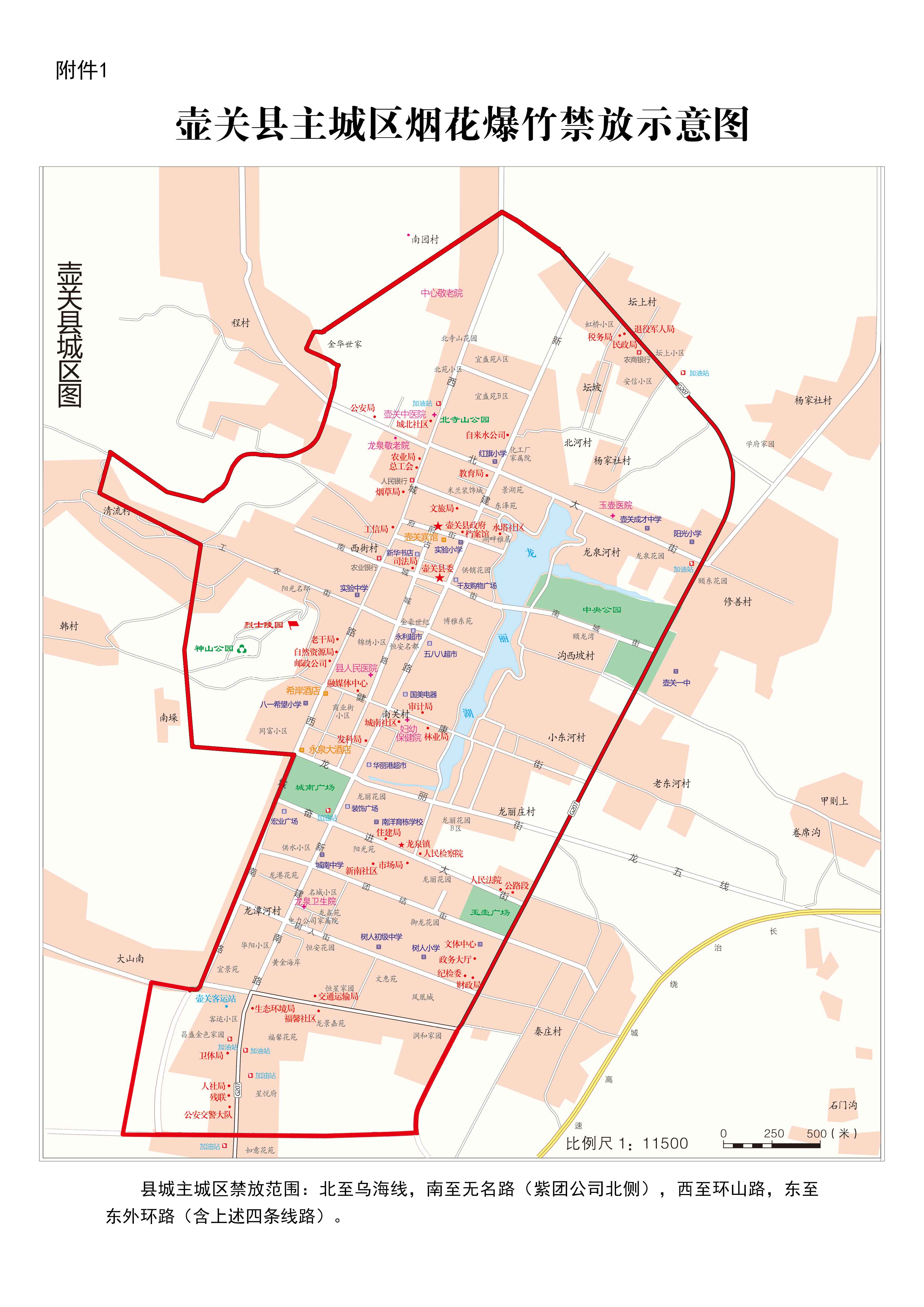 1.县城主城区禁放范围:北至乌海线,南至无名路(紫团公司北侧),西至环山路,东至东外环路(含上述四条线路)。