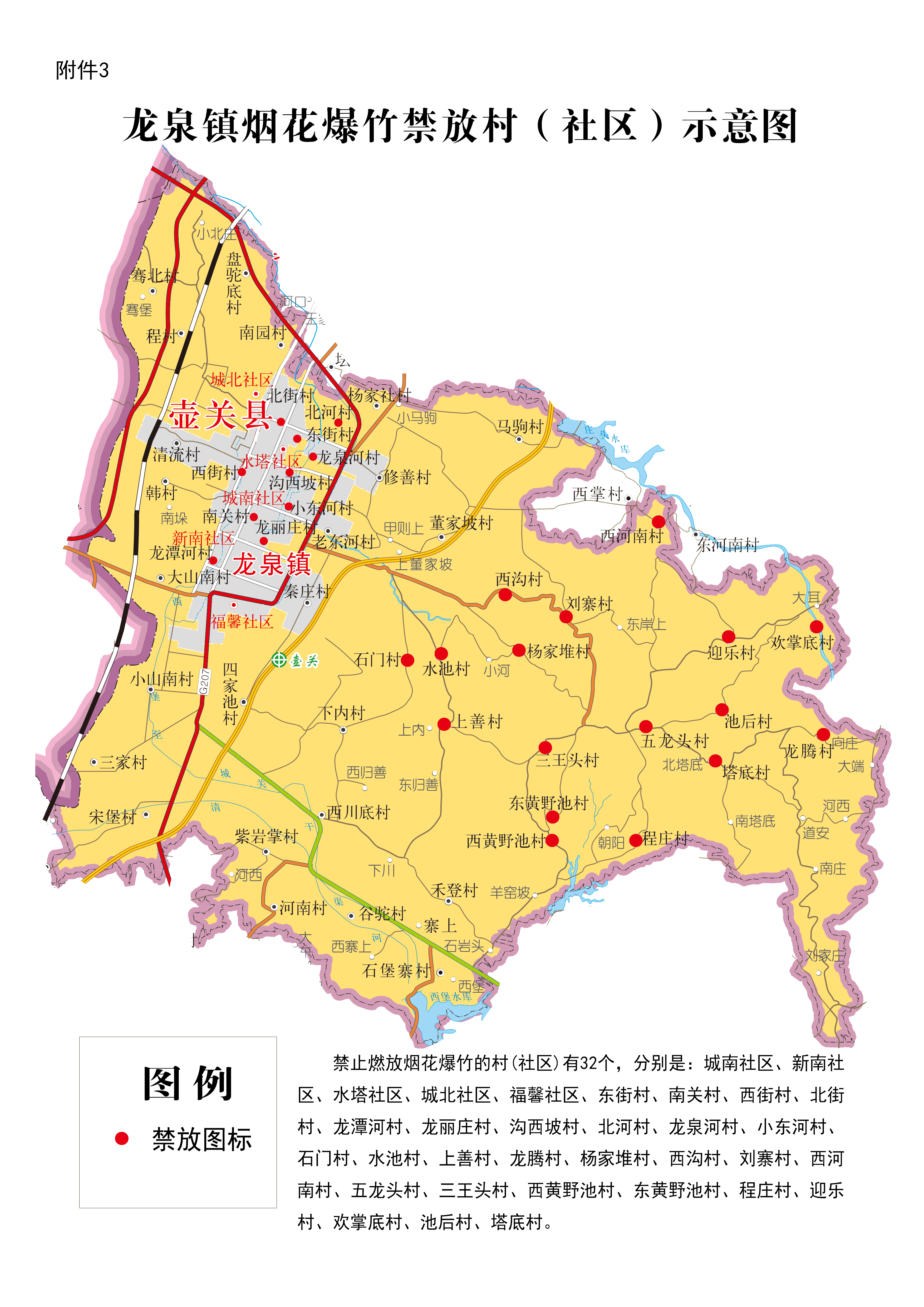 3.龙泉镇禁放范围:县城主城区包含的村(社区)以及石门村、水池村、上善村、龙腾村、杨家堆村、西沟村、刘寨村、西河南村、五龙头村、三王头村、西黄野池村、东黄野池村、程庄村、 迎乐村、欢掌底村、池后村、塔底村。