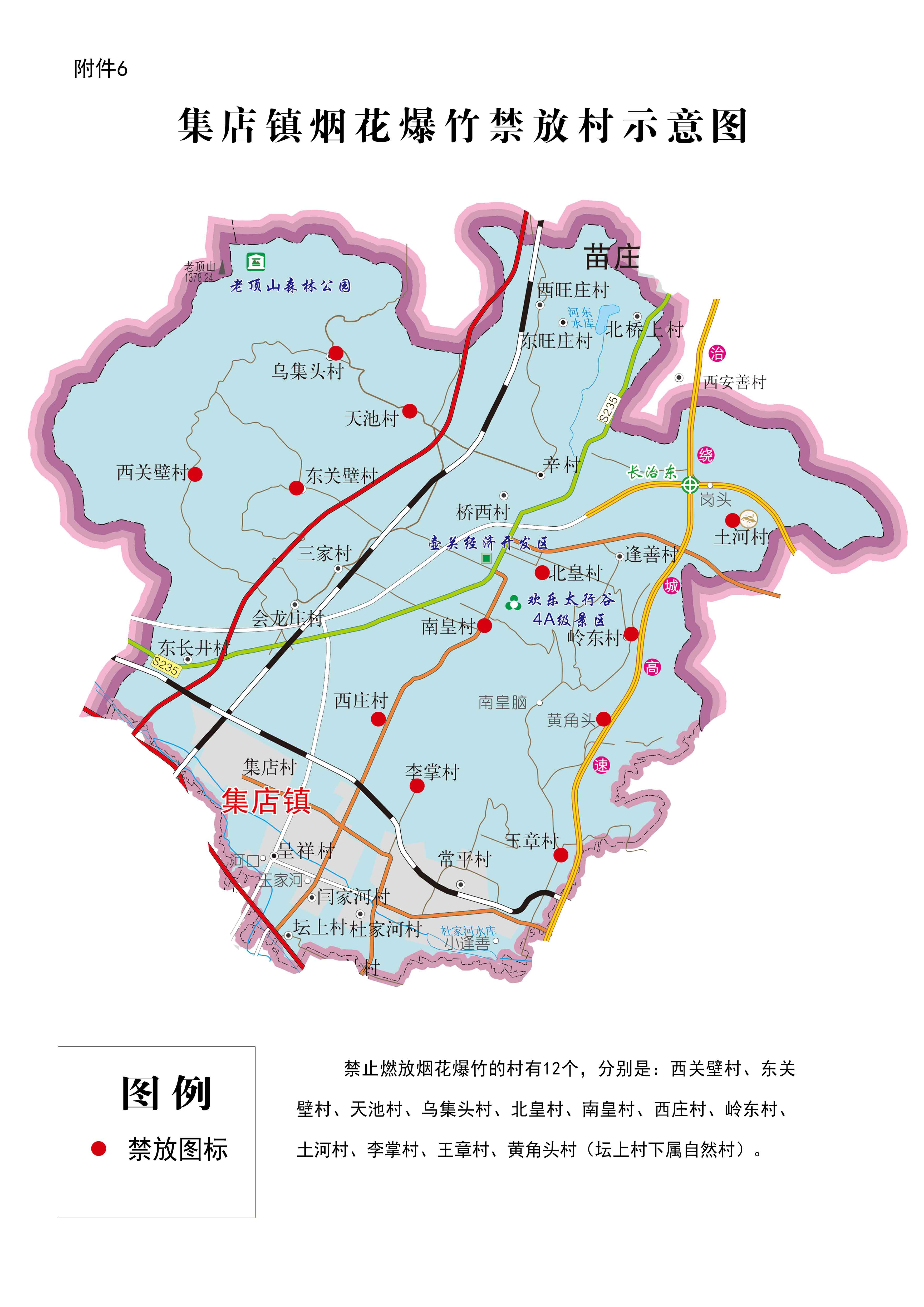 集店镇禁放范围:西关壁村、东关壁村、天池村、乌集头村、北皇村、南皇村、西庄村、岭东村、土河村、李掌村、王章村、黄角头村(坛上村下属自然村)。